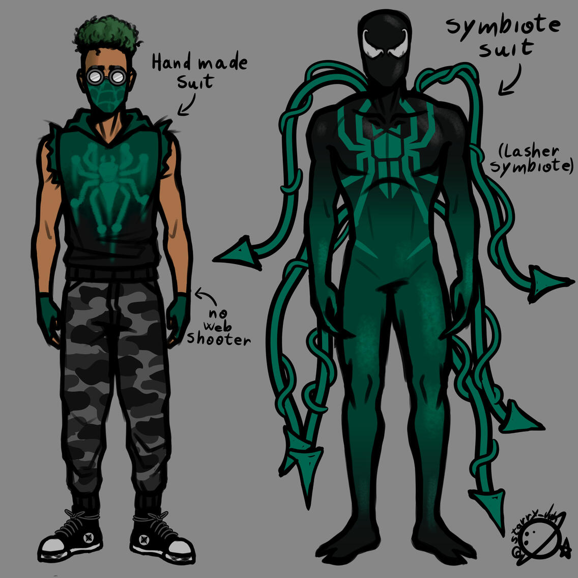 À esquerda o traje feito com os poucos recursos do personagem antes de se juntar a "Spider Society"À direita o traje feito como resultado da infecção pelo simbióte extradimencional.